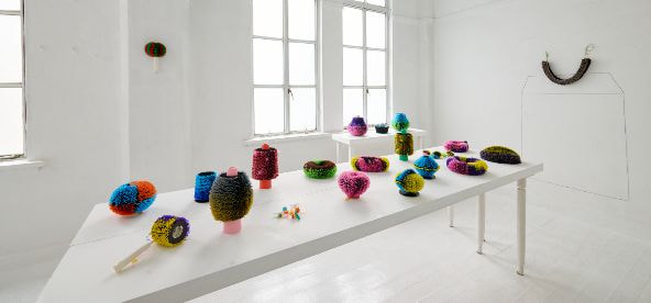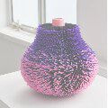 (布の経糸・緯糸を引っ張り、引く糸の緊張差で布の表情を変化、あるいは立体化する作品)