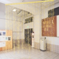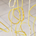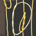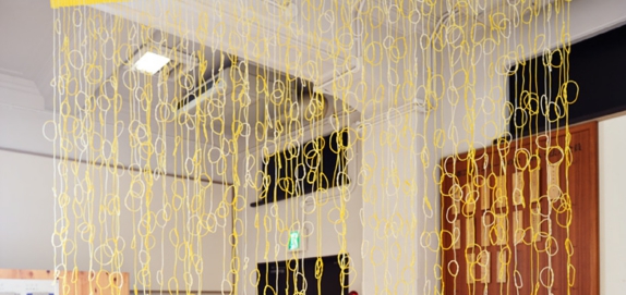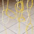 祇園祭の最後の神事となる「疫神社夏越祭」(えきじんじゃなごしまつり )が7月31日おこなわれます。これで祇園祭は幕をとじます。この半年の罪のけがれを祓い、夏以降の疫病除けを祈願する行事です。 素戔嗚尊(すさのうのみこと)に旅の宿を供して、難儀を救ったといわれる蘇民将来(そみんしょうらい)が、素戔嗚尊(すさのうのみこと)の教えに従い 腰に茅の輪を下げたところ子孫代々にいたるまで災いなく栄えたという 故事にちなみ、茅の輪をくぐる神事が伝わります。 わたしは“茅の輪のれん”をくぐることで、茅の輪くぐりによるご利益があればと、祈り、制作します。
