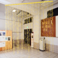 祇園祭の最後の神事となる「疫神社夏越祭」(えきじんじゃなごしまつり )が7月31日おこなわれます。これで祇園祭は幕をとじます。この半年の罪のけがれを祓い、夏以降の疫病除けを祈願する行事です。 素戔嗚尊(すさのうのみこと)に旅の宿を供して、難儀を救ったといわれる蘇民将来(そみんしょうらい)が、素戔嗚尊(すさのうのみこと)の教えに従い 腰に茅の輪を下げたところ子孫代々にいたるまで災いなく栄えたという 故事にちなみ、茅の輪をくぐる神事が伝わります。 わたしは“茅の輪のれん”をくぐることで、茅の輪くぐりによるご利益があればと、祈り、制作します。