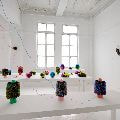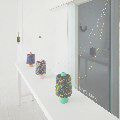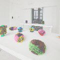 (色とりどりのビニールテープやごく薄の布を熱着処理した作品)
